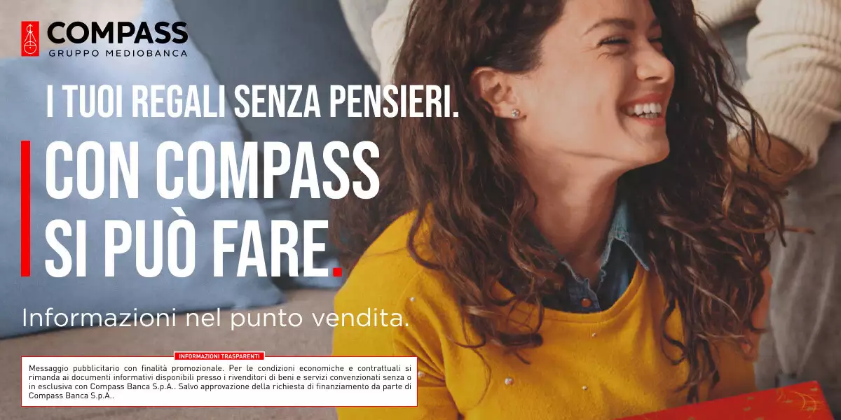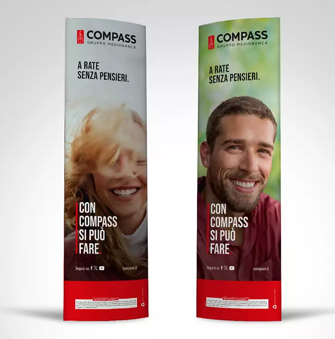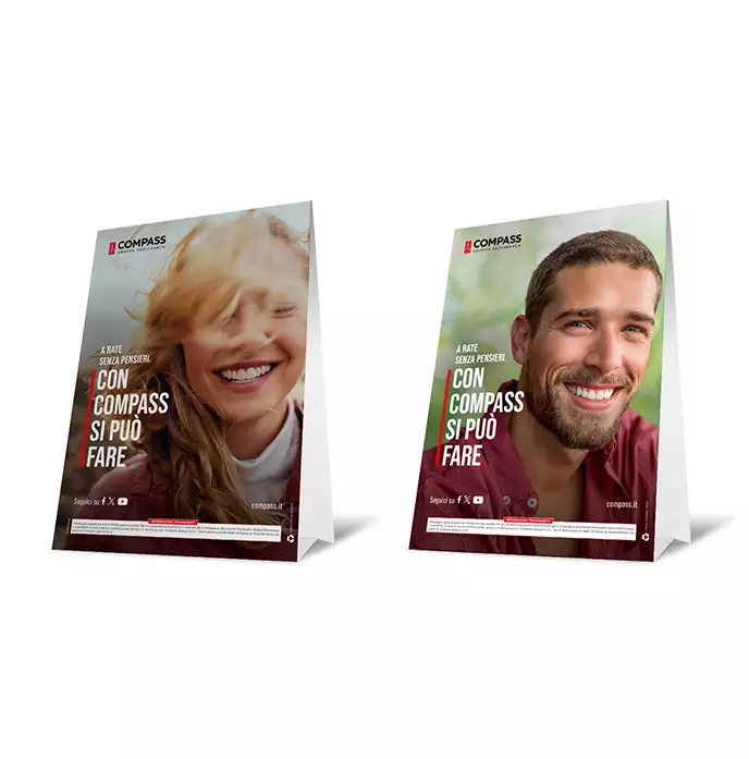 I supporti invitano la clientela, in modo semplice e immediato, a concretizzare serenamente gli acquisti di prodotti e servizi proposti con un finanziamento Compass.